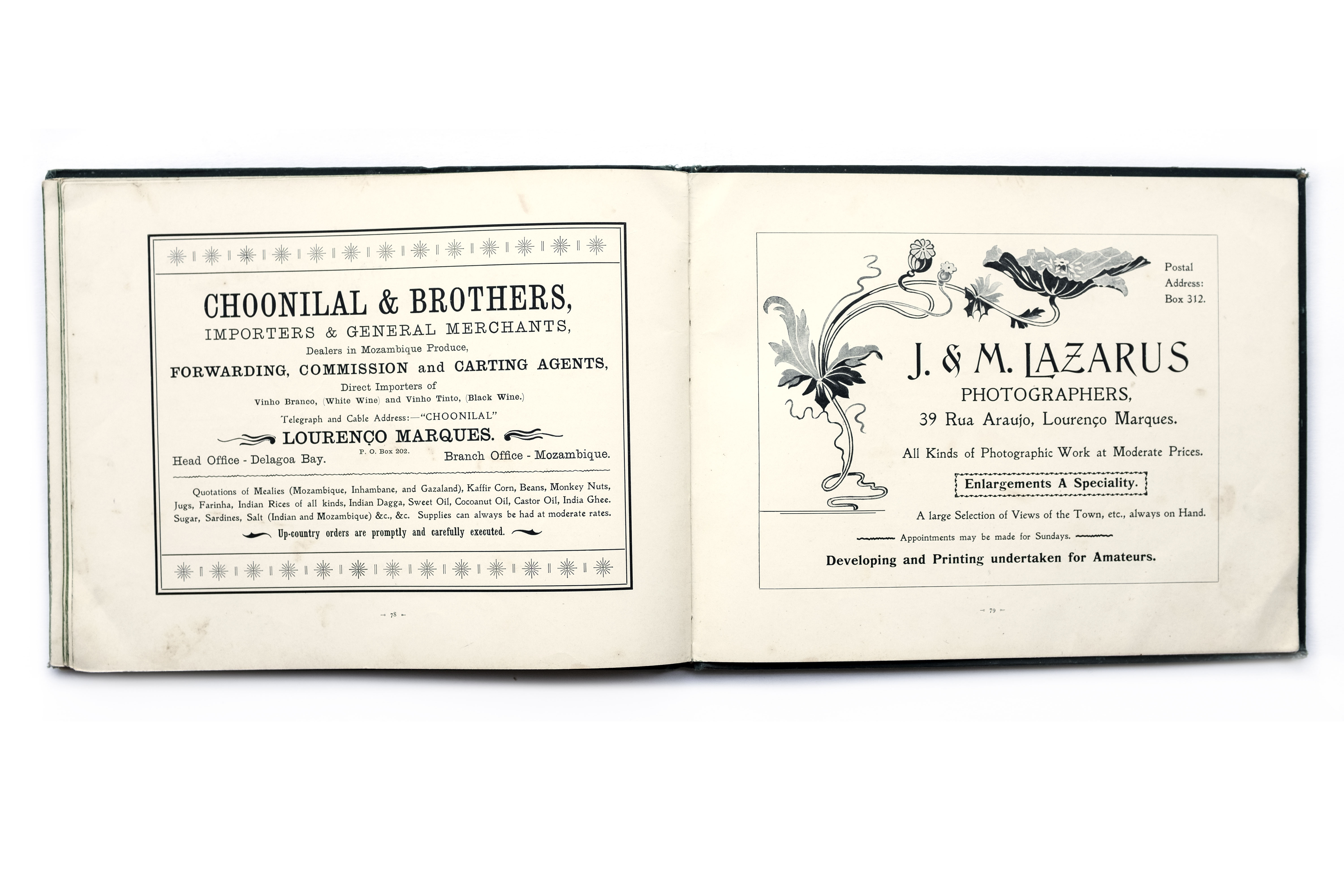 Title: A souvenir of Lourenço Marques Photographer(s): Joseph Lazarus and Maurice Lazarus Designer(s): – Writer(s): – Publisher: J. & M. Lazarus, Lourenço Marques 1901 Pages: 82 pp, 38 photographic plates and many advertisements Language: English ISBN: – Edition: – Dimensions: 29 x 23 cm Country: Mozambique