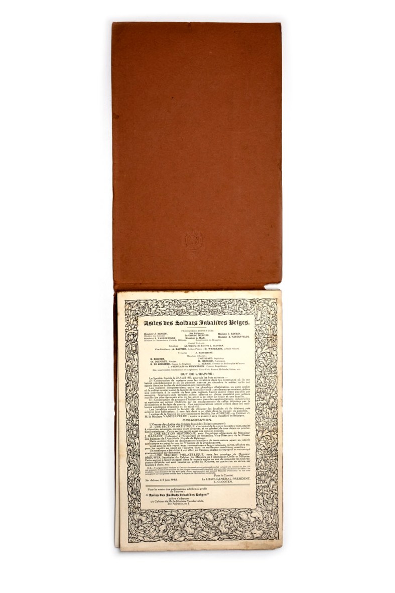 Title: Asiles des soldats invalides Belges Photographer(s): unknown, various photographers Designer(s): – Writer(s): H. Charton de WiartKing Albert and others Publisher: Société Asiles des soldats invalides Belges, Brussels (?) 1918 Pages: 104 pp. Booklet has a small text block, remaining one sided printed pages show photographs Language: French ISBN: – Edition: ‘Pour la vente des publications éditées au profit de l’oeuvre Asiles des Soldats Invalides Belges’. More publications like this are known. Dimensions: 16.5 x 22 cm Country: Belgian Congo