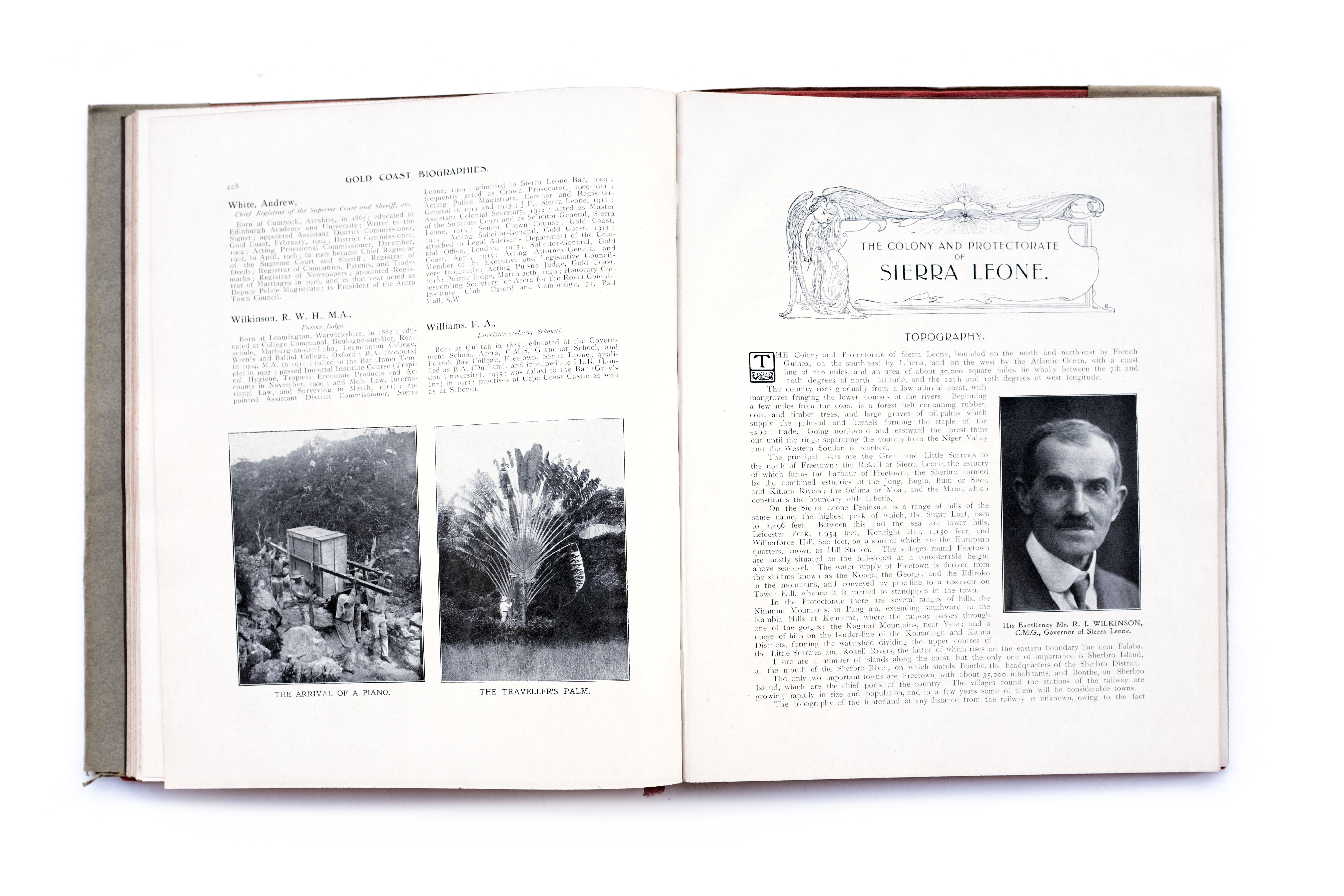 Title: The red book of West Africa: historical and descriptive, commercial and industrial facts, figures, and resources Photographer(s): George S.A. Da Costa (1853-1929), Frederick Richard Christian Lutterodt (1871-1937), Neils Walwin Holm (1865 – about 1927), Justus A.C. Holm (1888), Alphonso Lisk-Carew and Arthur Lisk-Carew, the Nicol Brothers and W.J. Sawyer (?) Designer(s): unknown Writer(s): Allister Macmillan Publisher: W.H. & L. Collingridge, London 1920 Pages: 314pp Language: English ISBN: – Dimensions: 22×28 cm Edition: First edition, a second edition was published in 1968 Country: Nigeria, Gambia, Sierra Leone, Gold Coast (Ghana)