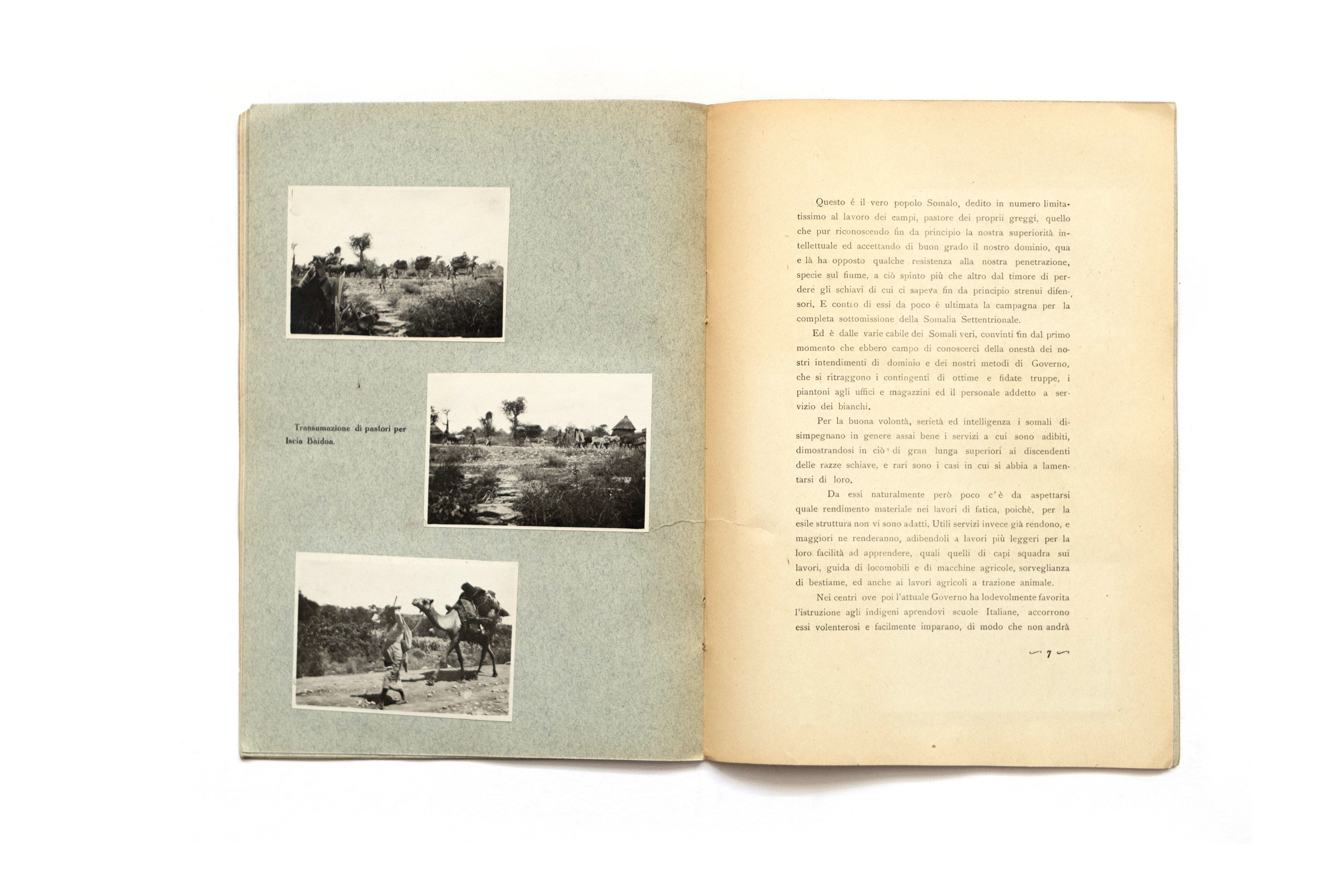 Title: Il popolo pastore delle Somalia ed il suo Bestiame Photographer(s): Dr. Maurizio Ferrio Designer(s): C. Bono – Monealvo Writer(s): Dr. Maurizio Ferrio Publisher: unknown, Italy 1927 Pages: 12 textpages and 8 pages with mounted photographs Language: Italian ISBN: – Dimensions: 17 x 24 cm Edition:   Country: Somalia