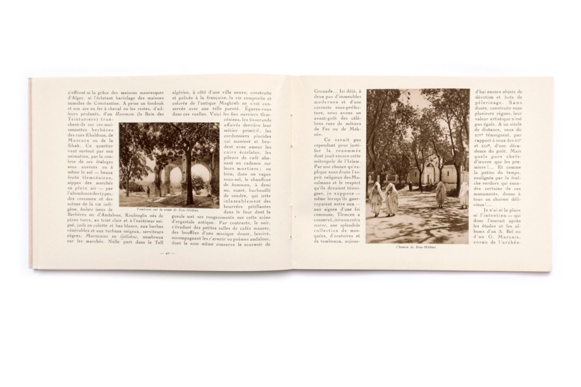 Title: Publication du centenaire de l’Algérie; La Cote Ouest, Oran et Tlemcen Photographer(s): collections du Service Photographique du Gouvernement Général de l’Algerie, du Touring Club de France, de la Compagnie Aérienne Française, de MM. le General de Bonneval, Bougault, Prouho, Caujolle, E. Monod, Jouve et Georges Rozet Designer(s): – Writer(s): Georges Rozet Publisher: Le Commissariat Général du Centenaire, collection de Horizons de France, Paris 1929) Pages: 64 Language: French ISBN: Dimensions: 20×15 cm Edition/Print run: Country: Algeria