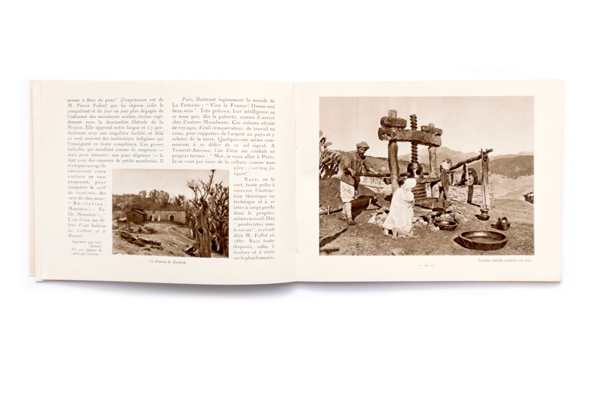Title: Publication du centenaire de l’Algérie; Les Kabylies et l’Aurés Photographer(s): collections du Service Photographique du Gouvernement Général de l’Algerie, du Touring Club de France, de la Compagnie Aérienne Française, de MM. le General de Bonneval, Bougault, Prouho, Caujolle, E. Monod, Jouve et Georges Rozet Designer(s): – Writer(s): Georges Rozet Publisher: Le Commissariat Général du Centenaire, collection de Horizons de France, Paris 1929) Pages: 64 Language: French ISBN: Dimensions: 20×15 cm Edition/Print run: Country: Algeria
