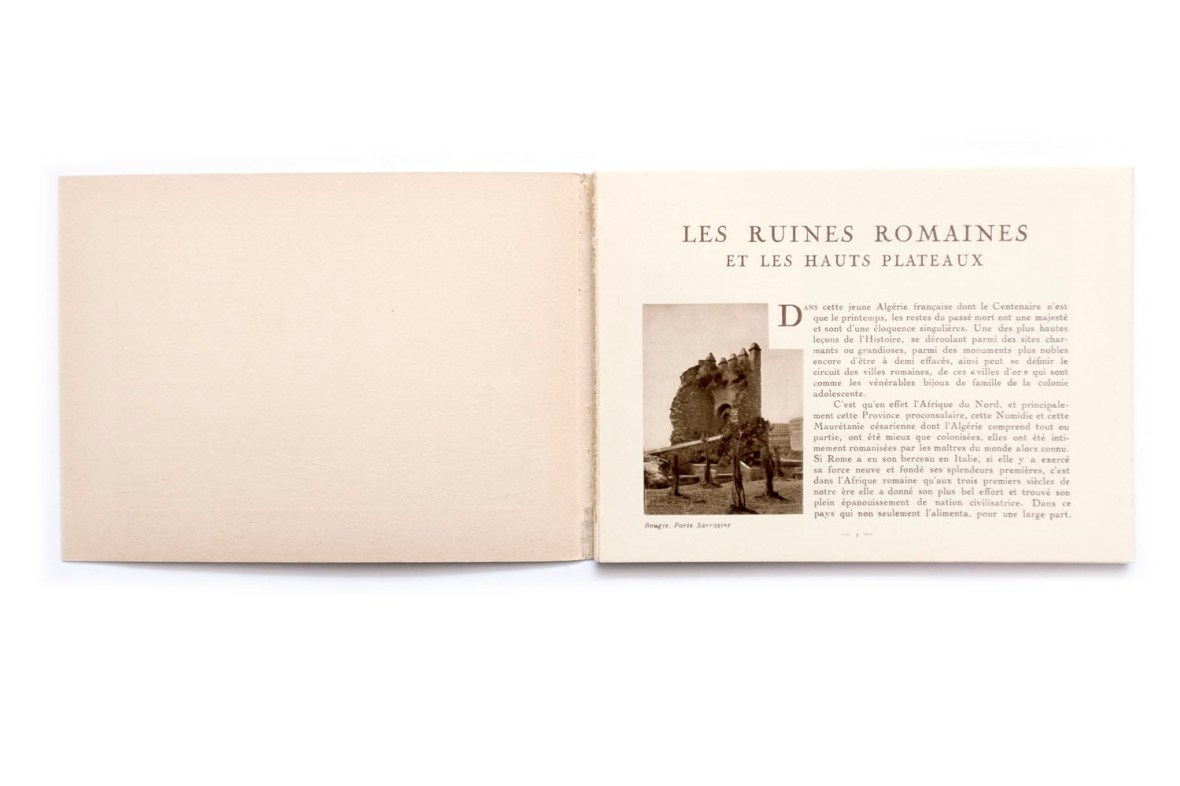 Title: Publication du centenaire de l’Algérie; Les ruines Romaines et les hauts plateaux Photographer(s): collections du Service Photographique du Gouvernement Général de l’Algerie, du Touring Club de France, de la Compagnie Aérienne Française, de MM. le General de Bonneval, Bougault, Prouho, Caujolle, E. Monod, Jouve et Georges Rozet Designer(s): – Writer(s): Georges Rozet Publisher: Le Commissariat Général du Centenaire, collection de Horizons de France, Paris 1929) Pages: 64 Language: French ISBN: Dimensions: 20×15 cm Edition/Print run: Country: Algeria