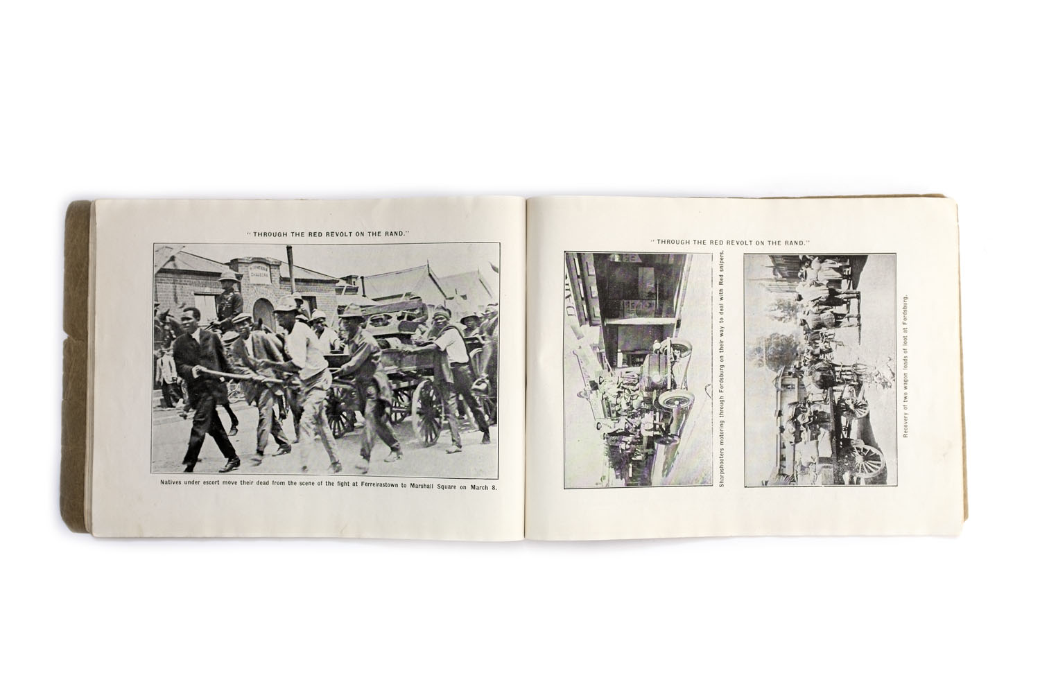 Title: Through the red revolt on the Rand Photographer(s): ‘compiled from photoraphs taken by Representatives of “The Star” Writer(s): The Star office Publisher: Central News Agency, Ltd., Johannesburg 1922 Pages: 68 Language: English ISBN: – Dimensions: 25 x 18.5 cm Edition: This is the second edition with a different sequence and some other photographs. Country: South Africa