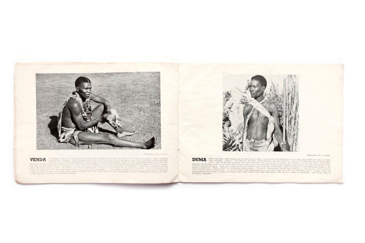 Title: African Tribes employed on the Witwatersrand Gold Mines Photographer(s): L. G. Hallett and M.A.F. Helm Designer(s): – Writer(s): C.L. Real (?), chairman of The Prevention of Accidents Committee. Publisher: Witwatersrand Gold Mining Industry. Prevention of Accidents Committee, Johannesburg 1944 Pages: 40 Language: English ISBN: – Dimensions: 25 x 18cm Edition: Second edition (November 1944). A limited number of copies was printed in a first edition published in March 1944. Rerpinted on courtesy of the Prevention of Accidents Committee of the Witwatersrand Gold Mining Industry. Profits of the sale of this brochure were to be donated to war funds. Country: South Africa