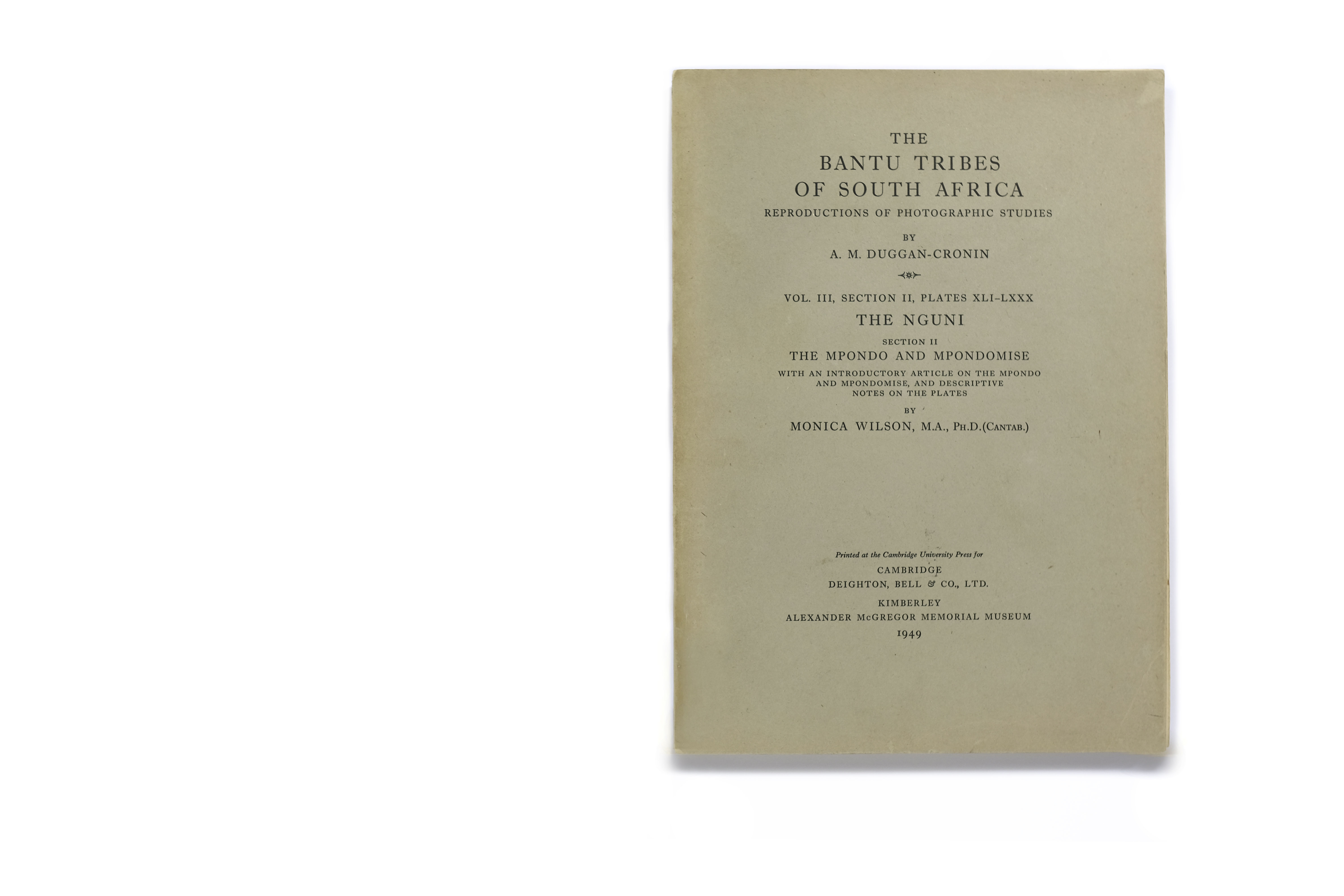 Title: The Bantu Tribes of South Africa. Volume III: Section II, Plates XLI-LXXX: The Nguni: the Mpondo and Mpondomise Photographer(s): Alfred Martin Duggan-Cronin Designer(s): – Writer(s): Monica Wilson Publisher: Deighton, Bell & Co., Cambridge 1949 and Alexander McGregor Memorial Museum, Kimberley 1949 Pages: 40 photographic plates (41-80) plus text pages Language: English Dimensions: 21 x 30 cm Edition: ? Country: South Africa
