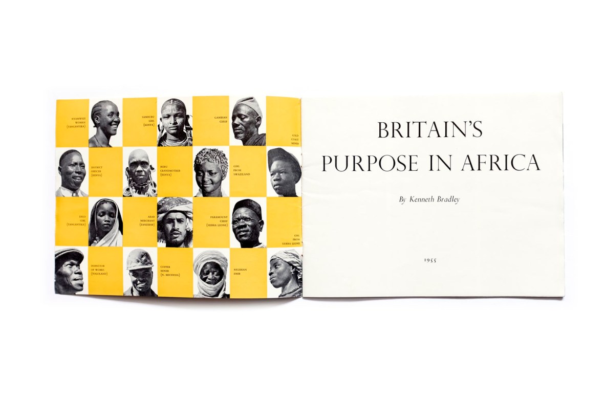 Title: Britain’s purpose in Africa Photographer(s): unknown Designer(s):  Writer(s): Kenneth Bradley Publisher: The Central Office of Information, London 1955 Pages: 32 Language: English ISBN:  Edition: Dimensions: 22.5 x 17.5 cm Country: Various Countries