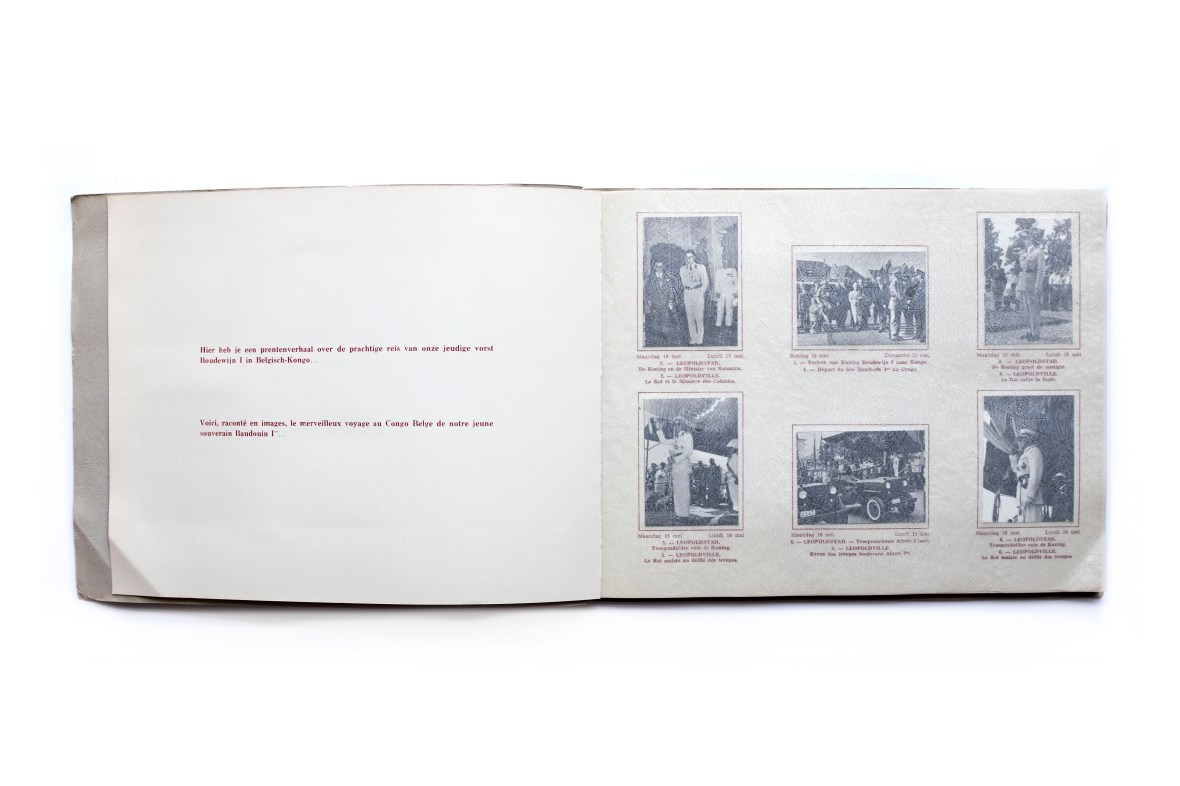 Title: Reis van Zijne Majesteit Koning Boudewijn I in Belgisch-Kongo in het jaar 1955 Photographer(s): unknown Designer(s): unknown Writer(s): unknown Publisher: Lacsia Solac, Wespelaar 1955 Pages: 24 pp Language: Dutch and French ISBN: – Dimensions: 30 x 23cm Edition: An album by milk company Lacsia containing tipped in photographs Country: Belgian Congo
