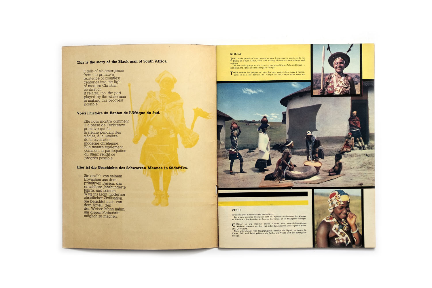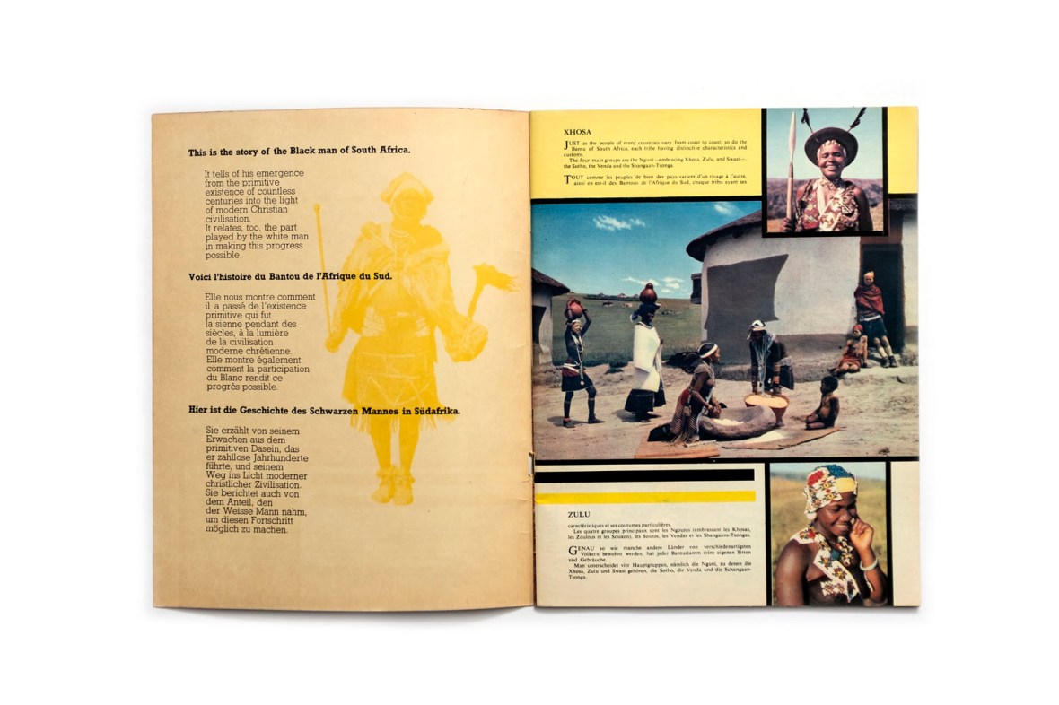 Title: The Black Man’s Progress in South Africa Photographer(s): Various photographers, S.A. Tourist Corporation Writer(s): – Designer(s): – Publisher: State information Office, n.p. / n.d.  Language: English, French and German ISBN: – Dimensions: 21 x 27,5 cm Edition: This booklet, issued by the State Information Office, is  a reprint of an article which appeared in Lantern, the Journal of the South African Association for Adult Education in 1956. Country: South Africa