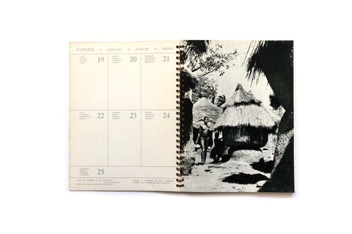 Title: Visages d’Afrique Photographer(s): Carl Damas, Manciet, Galley, Dehuz, Martin, Dominique Darbois a.o. Designer(s): – Writer(s): – Publisher: L’Air Liquide (Compagny), Paris 1959 Pages: Calendar with approx. 52 photographic plates Language: French, English, German and Spanish ISBN: – Dimensions: 17 x 23 cm Edition: Country: Various countries
