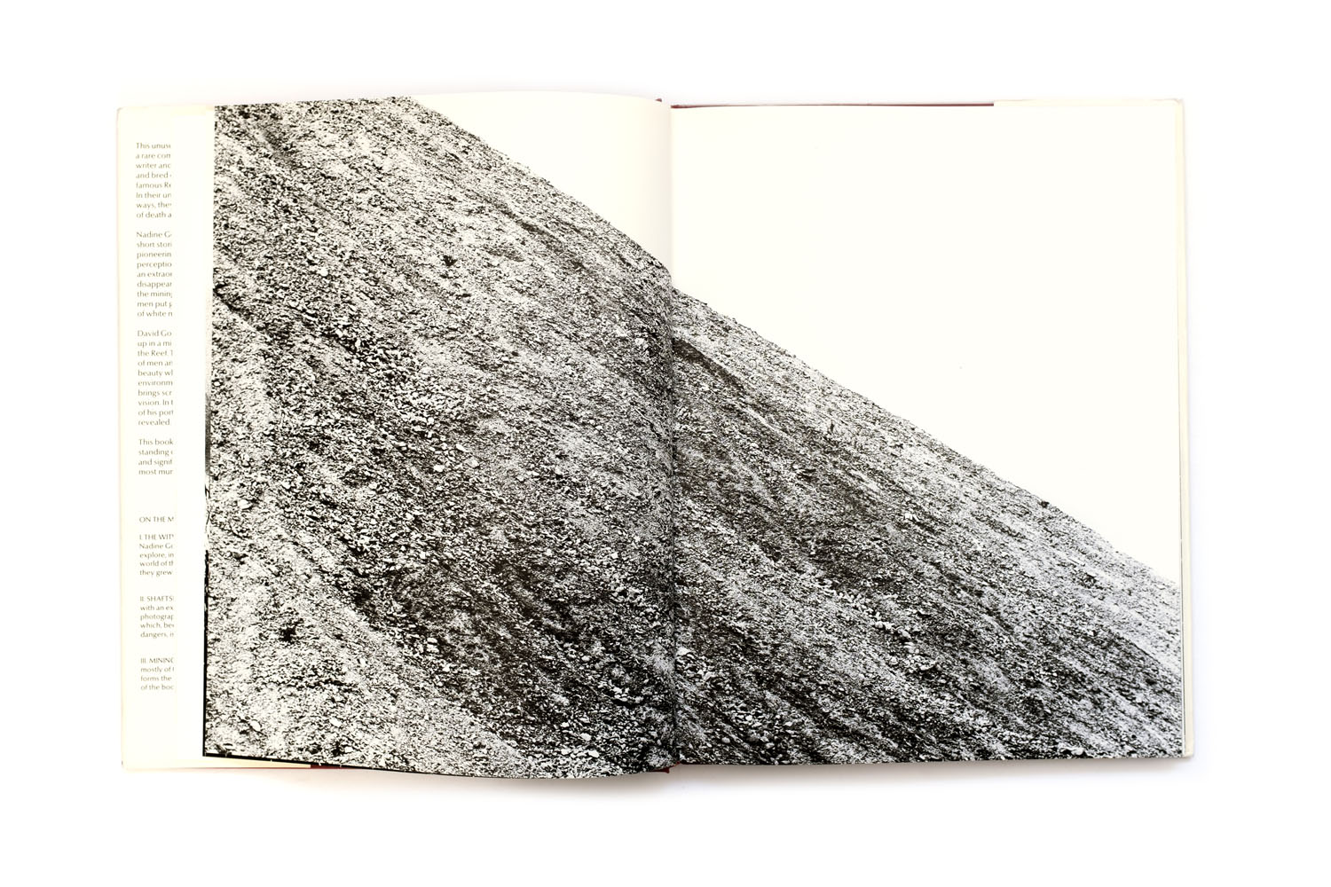 Title: On the mines Photographer(s): David Goldblatt Designer(s): David Goldblatt Writer(s): David Goldblatt and Nadine Gordimer Publisher: C. Struik (PTY) Ltd, Cape Town, 1973 Pages: 136 Language: English ISBN: 0 86977 029 2 Dimensions: 25 x 33 cm Edition: unknown, the book was published in grey and (more scarce) cloth. Steidl published a new version of the book. Country: South Africa