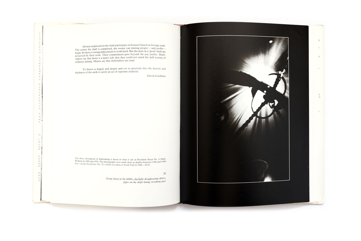Title: On the mines Photographer(s): David Goldblatt Designer(s): David Goldblatt Writer(s): David Goldblatt and Nadine Gordimer Publisher: C. Struik (PTY) Ltd, Cape Town, 1973 Pages: 136 Language: English ISBN: 0 86977 029 2 Dimensions: 25 x 33 cm Edition: unknown, the book was published in grey and (more scarce) cloth. Steidl published a new version of the book. Country: South Africa