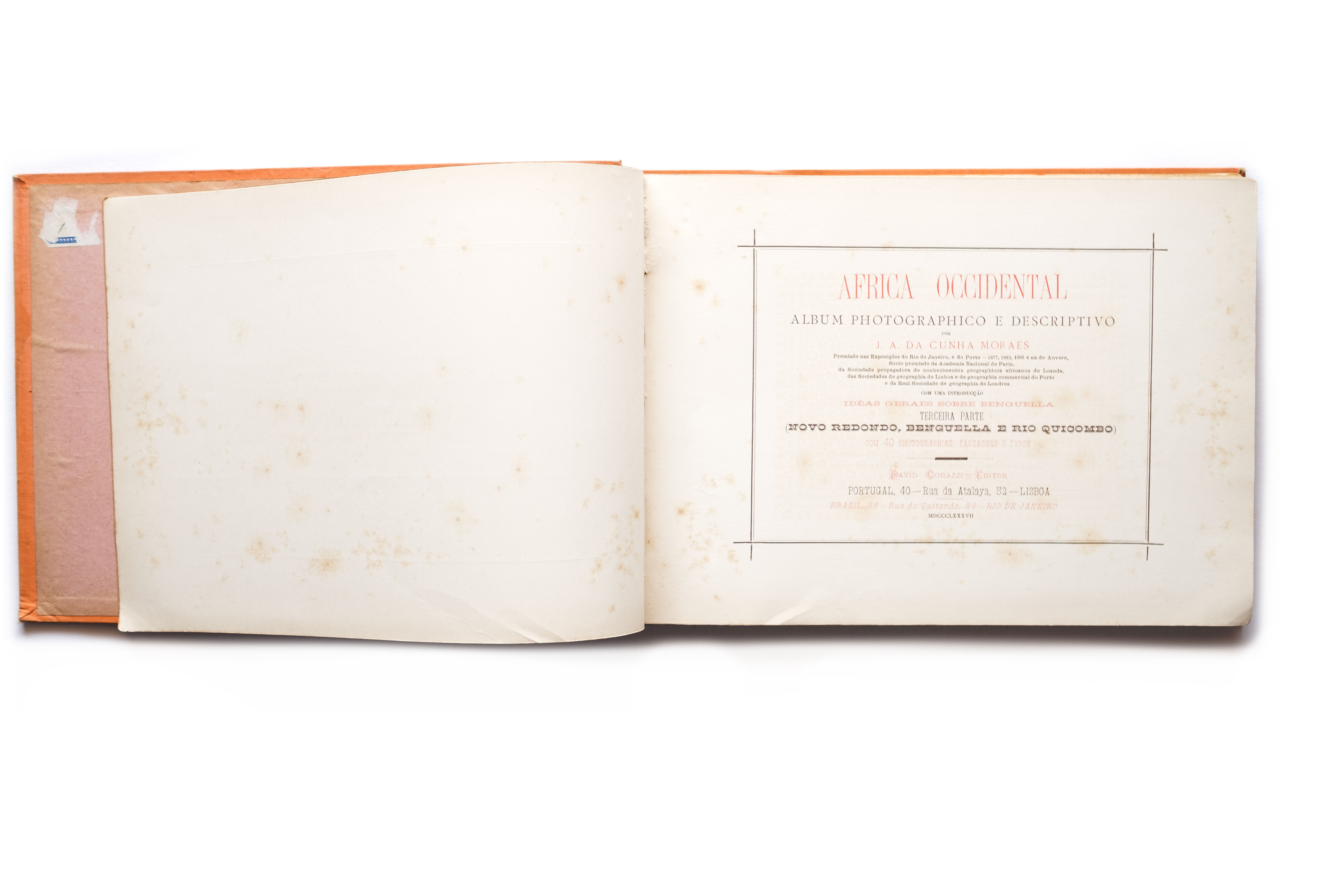 Title: Africa Occidental – Album Photográphico e Descriptivo. Terceira parte Photographer(s): José Augusto da Cunha Moraes (1855-1933) Designer(s): most probably David Corazzi Writer(s): José Augusto da Cunha Moraes Publisher: David Corazzi, Lisbon 1887 Pages: text pages with 40 collotypes Language: Portuguese ISBN: – Dimensions: 29.5 x 21 cm Edition: ? Country: Angola