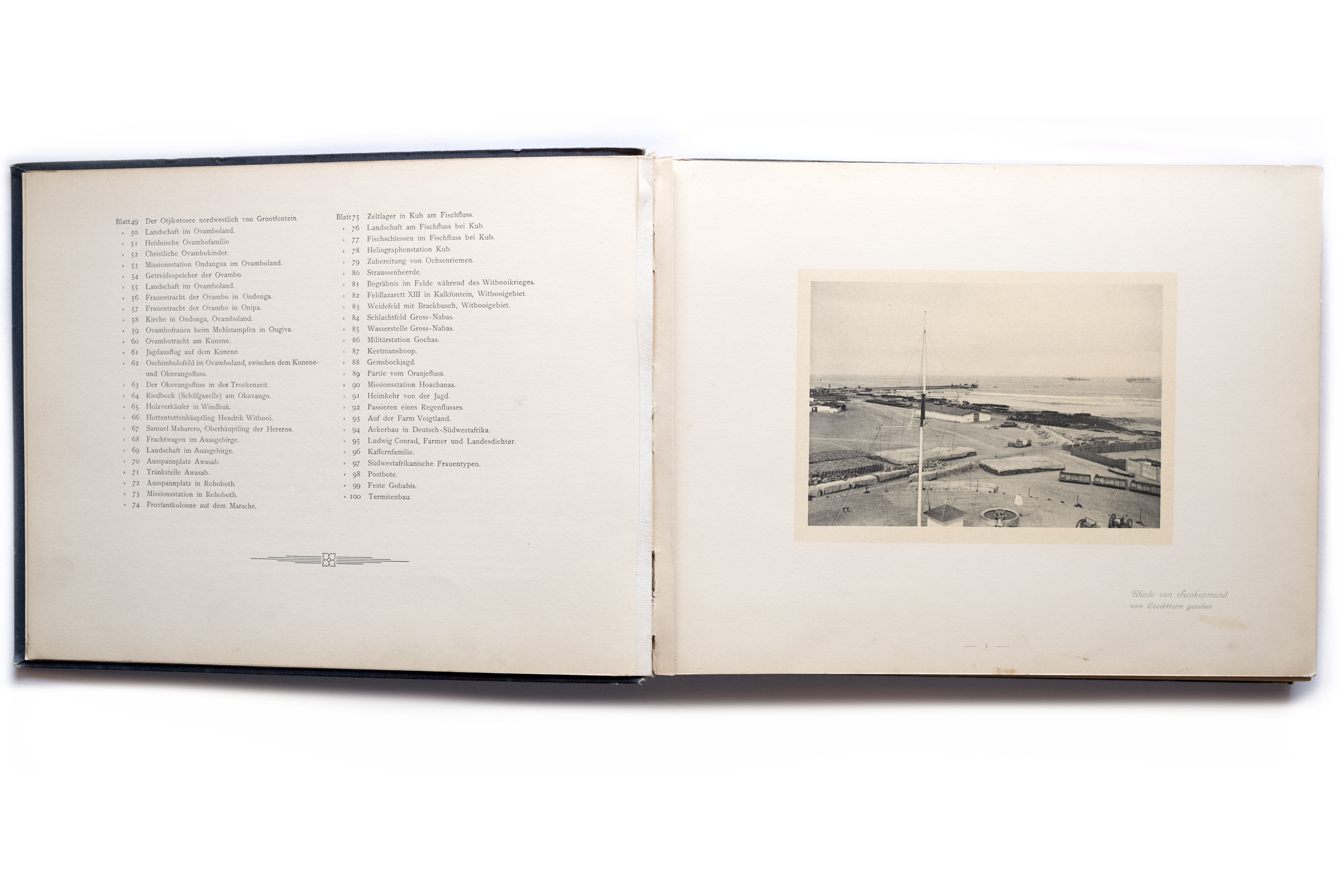 Title: Deutsch-Südwest-Afrika. Kriegs- und Friedensbilder. 100 Original-Aufnahmen von Friedrich Lange in Windhuk Photographer(s): Friedrich Lange Designer(s): – Writer(s): Friedrich Lange Publisher: Windhuk Verlag Franz Rohloff, Winhoek 1907 Pages: 100 photographic plates and text block with loose map Language: German ISBN: – Dimensions: 25 x 32 cm Edition: ? Country: Namibia