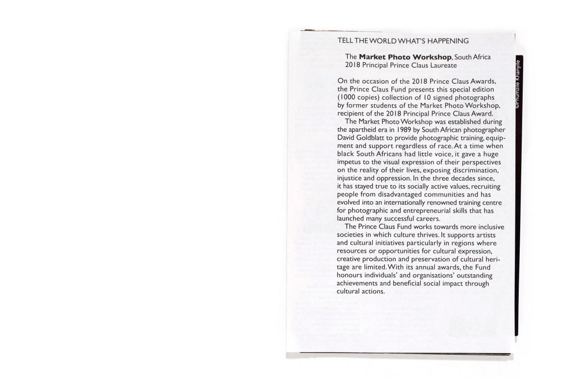 Title: Tell the world what’s happening Photographer(s): Katlego Trevor Tlhapi, Matt Kay, Sipho Gonxeka, Nkosinathi Khumalo, Phumzile Khanyile, Zaituna Euridice, Jerry Opaken Gaegane, Moho Mokgadi, Lindokuhle Sobekwa and Nokuthula Mbatha Designer(s): – Writer(s): – Publisher: Market Photo Workshop, Johannesburg 2018 Pages: 10 photographs Language: English ISBN: – Dimensions: 15 x 20,5 cm Edition: Country: South Africa