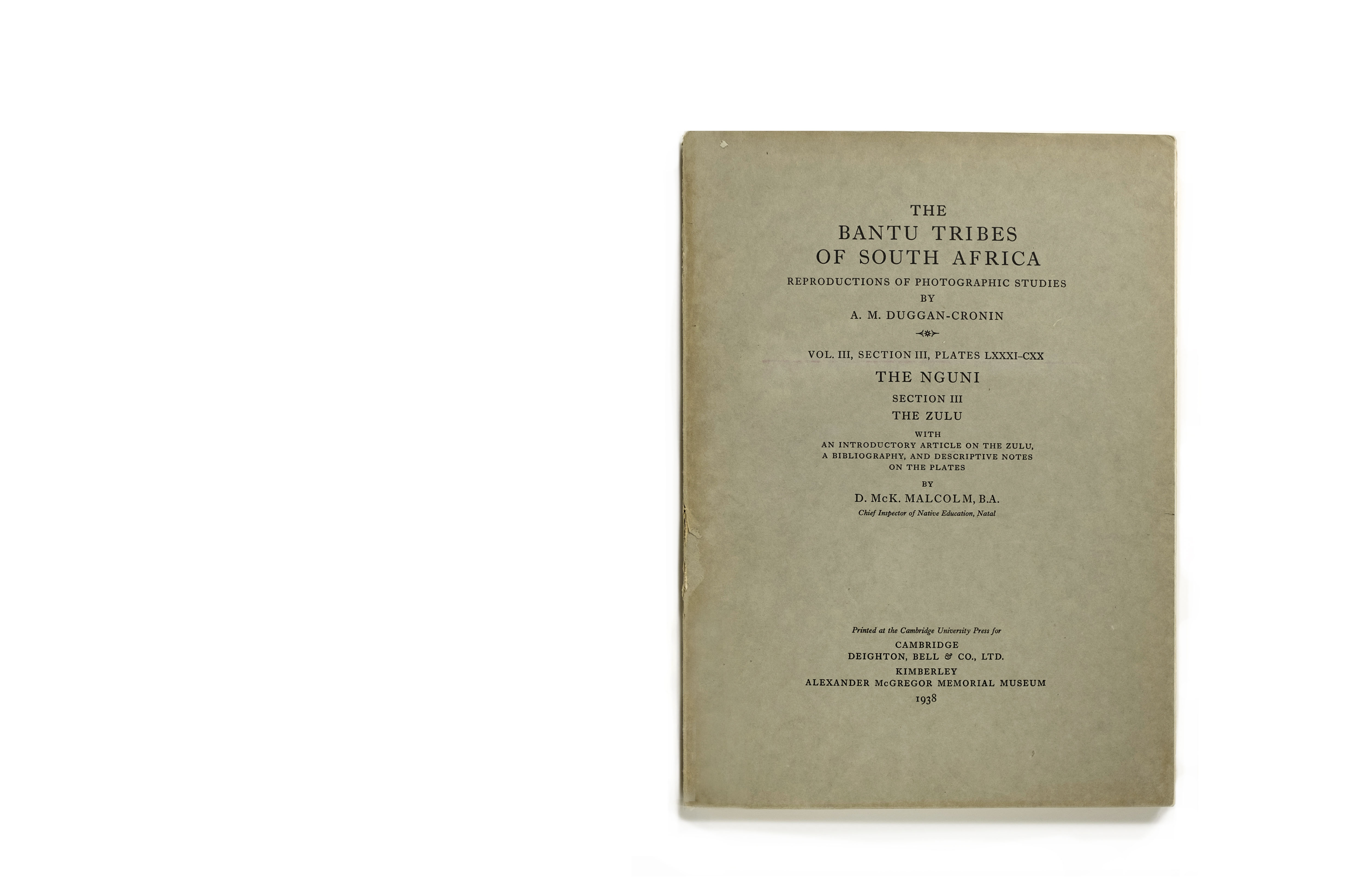 Title: The Bantu Tribes of South Africa. Volume III: Section III, Plates LXXXI-CXX: The Nguni: the Zulu Photographer(s): Alfred Martin Duggan-Cronin Designer(s): – Writer(s): D. Mc. K. Malcolm Publisher: Deighton, Bell & Co., Cambridge 1938 and Alexander McGregor Memorial Museum, Kimberley 1938 Pages: 40 photographic plates (81-120) plus text pages Language: English Dimensions: 21 x 30 cm Edition: ? Country: South AfricaTitle: The Bantu Tribes of South Africa. Volume III: Section III, Plates LXXXI-CXX: The Nguni: the Zulu Photographer(s): Alfred Martin Duggan-Cronin Designer(s): – Writer(s): D. Mc. K. Malcolm Publisher: Deighton, Bell & Co., Cambridge 1938 and Alexander McGregor Memorial Museum, Kimberley 1938 Pages: 40 photographic plates (81-120) plus text pages Language: English Dimensions: 21 x 30 cm Edition: ? Country: South Africa