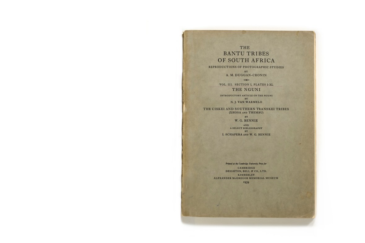 Title: The Bantu Tribes of South Africa. Volume III: Section I, Plates I-XL: The Nguni Photographer(s): Alfred Martin Duggan-Cronin Designer(s): – Writer(s): N.J. van Warmelo and W. G. Bennie Publisher: Deighton, Bell & Co., Cambridge 1939 and Alexander McGregor Memorial Museum, Kimberley 1939 Pages: 40 photographic plates plus text pages Language: English Dimensions: 21 x 30 cm Edition: ? Country: South Africa
