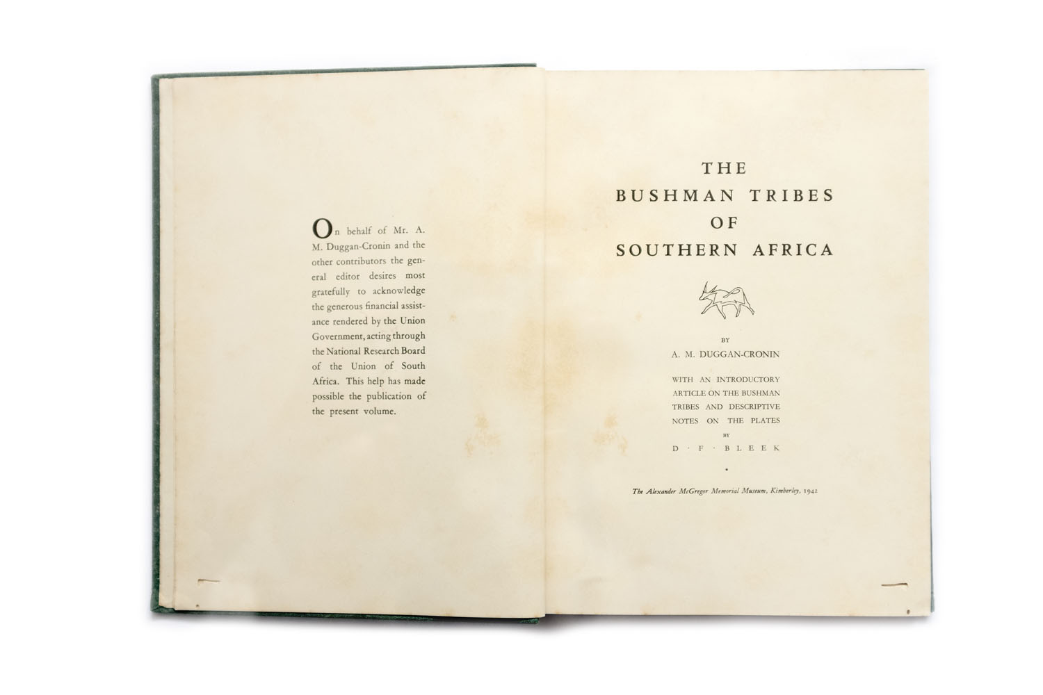 Title: The Bushman tribes of Southern Africa Photographer(s): Alfred Martin Duggan-Cronin Designer(s): – Writer(s): D.F. Bleek (introductory article on the Bushman tribes and descriptive notes on the plates) Publisher: The Alexander McGregor Memorial Museum, Kimberley 1942 Pages: 14 pages + 40 full-page plates from photographs, green cloth Language: English ISBN:  Dimensions: 18.5 x 25.5 cm Edition/Print run: Country: South Africa